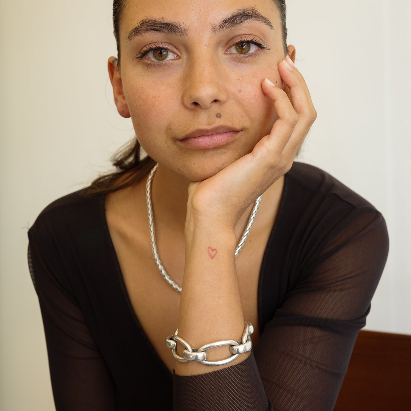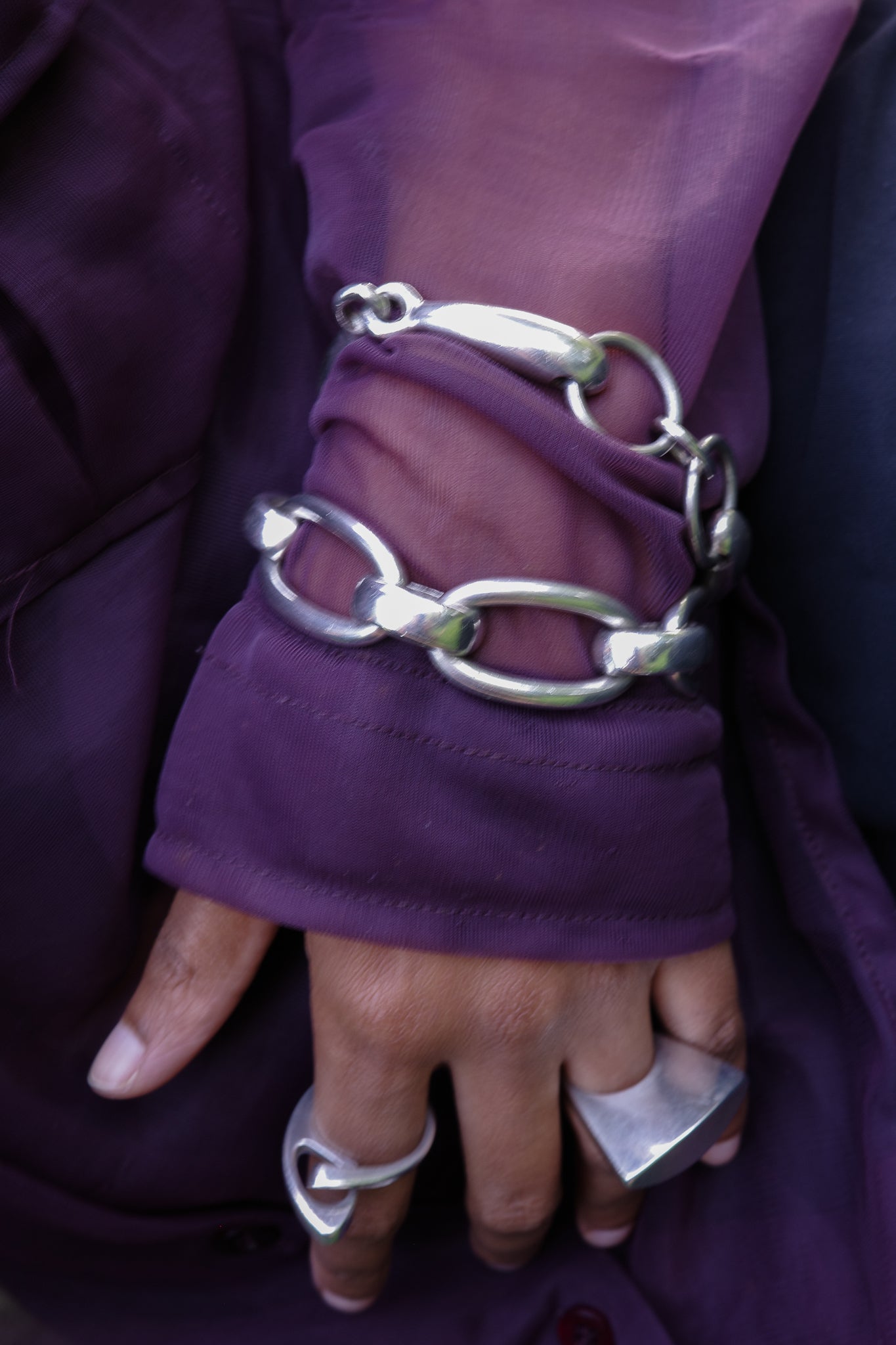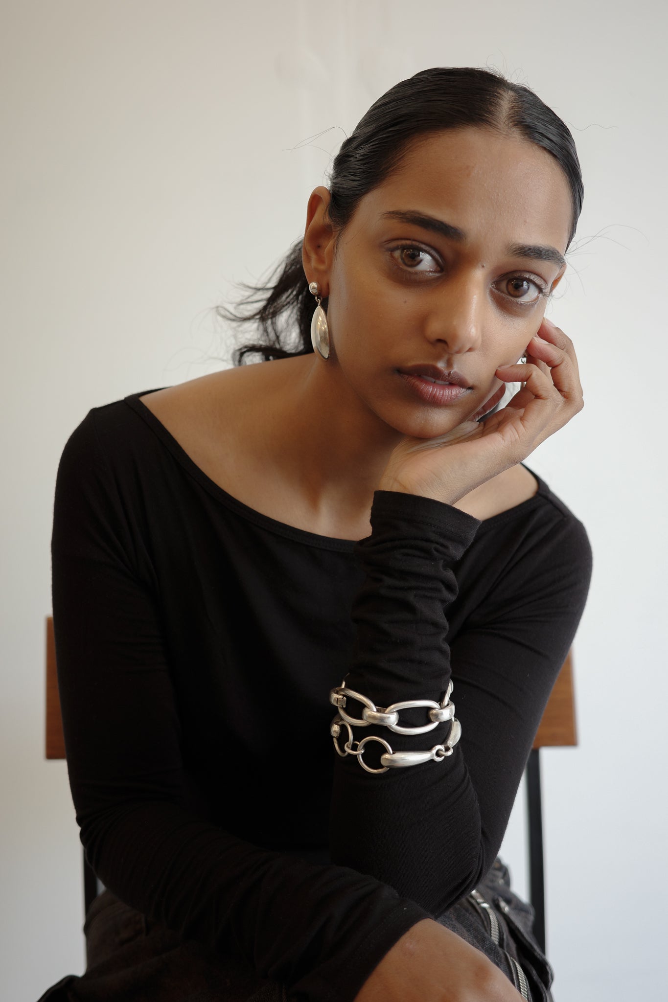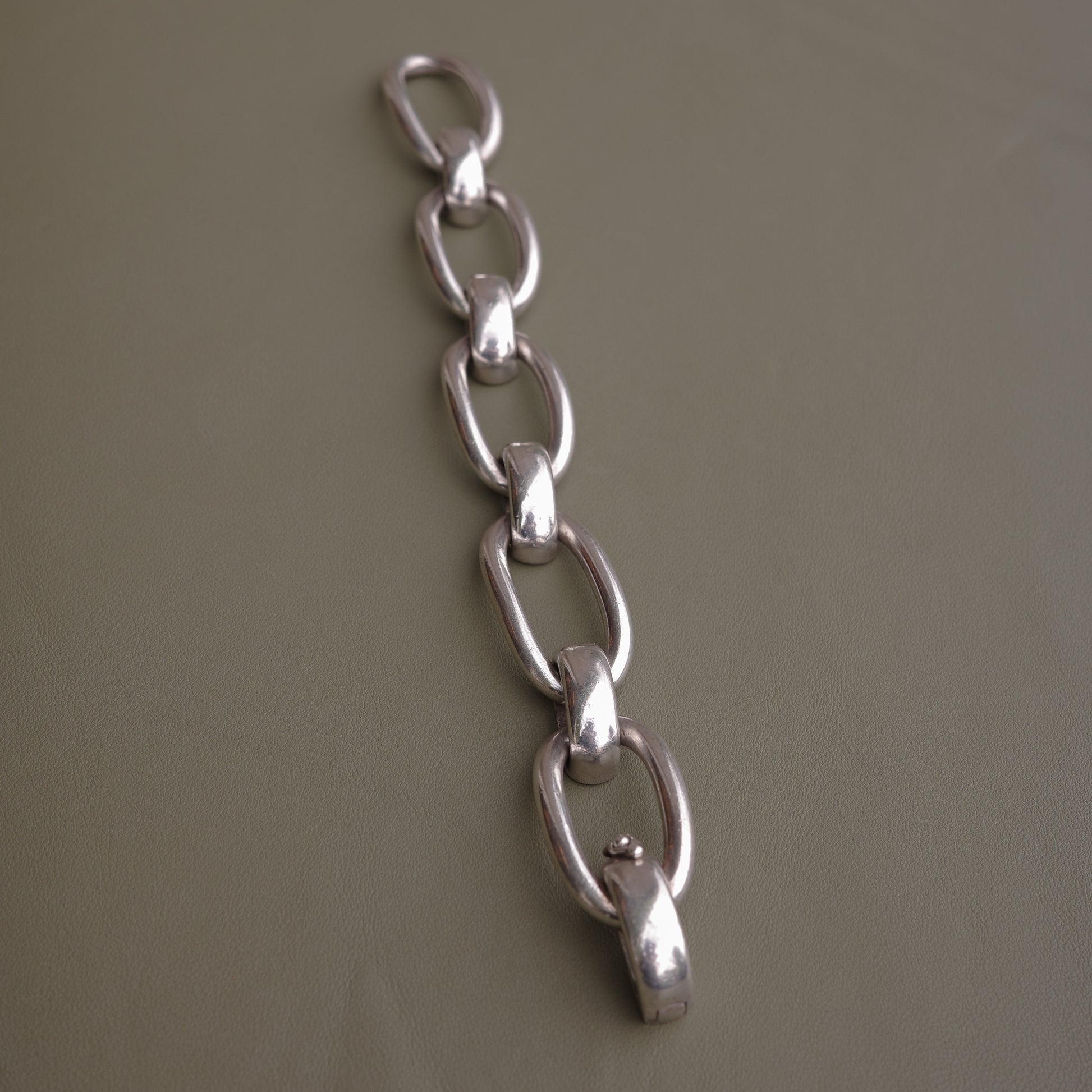 A bold vintage bracelet crafted from solid silver, featuring chunky oval links interwoven with connecting bars that give the piece a sculptural, voluminous feel. The bracelet has beautiful weight and presence, showcasing great craftsmanship and a timeless design. It fastens securely with a box clasp, blending seamlessly into the form. Though all three hallmarks are present, they have worn with time and are now illegible. A substantial, statement piece with unmistakable character.