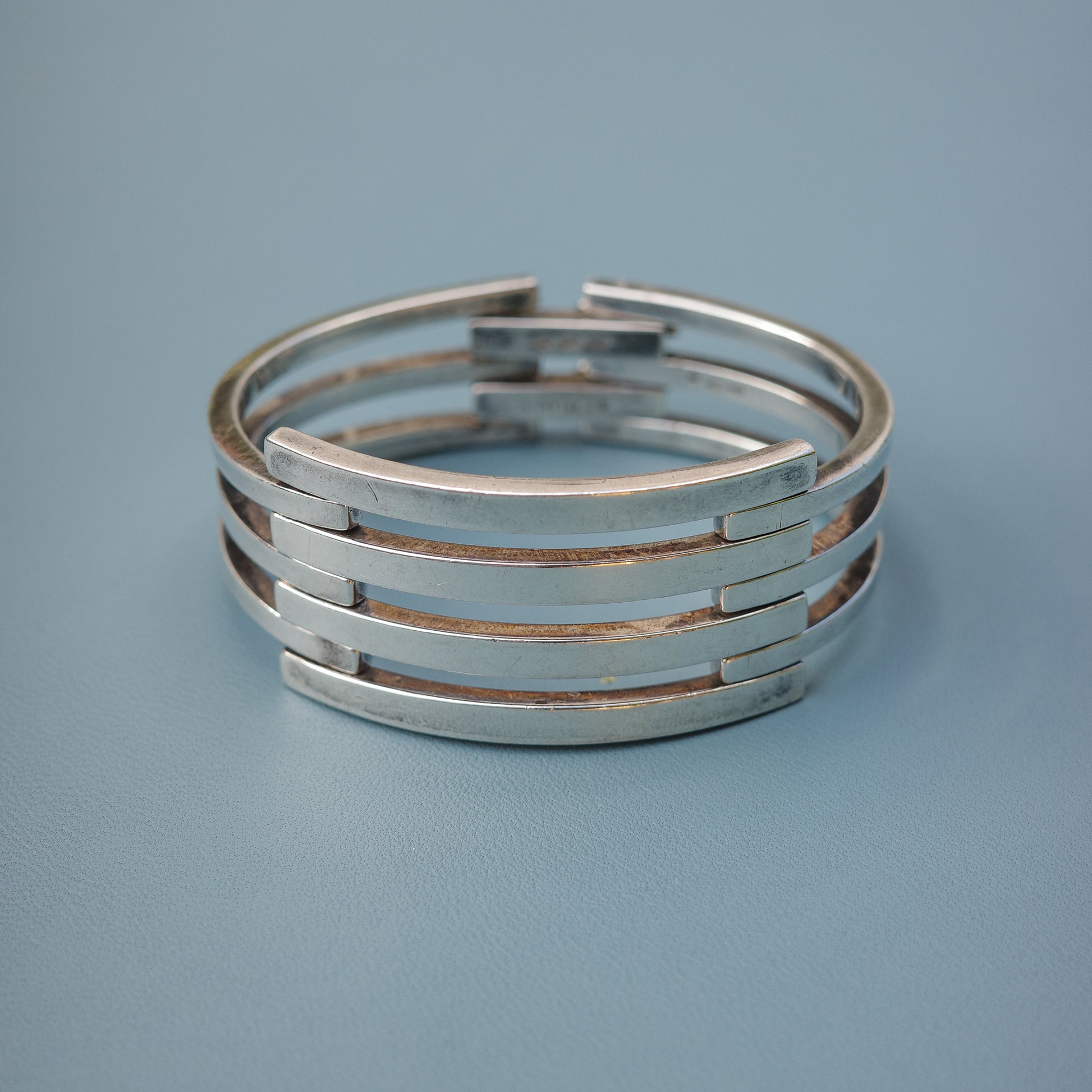 Signed O.P. Orlandini, this sculptural bangle is a striking example of Italian modernist design — likely crafted for UnoAErre during the post-war design boom. The hinged construction and precise geometric rhythm give it architectural weight, almost like a miniature Brutalist façade rendered in silver. Sourced in France, it’s a true collector’s piece: commanding, sculptural, unmistakably 20th-century Italian.