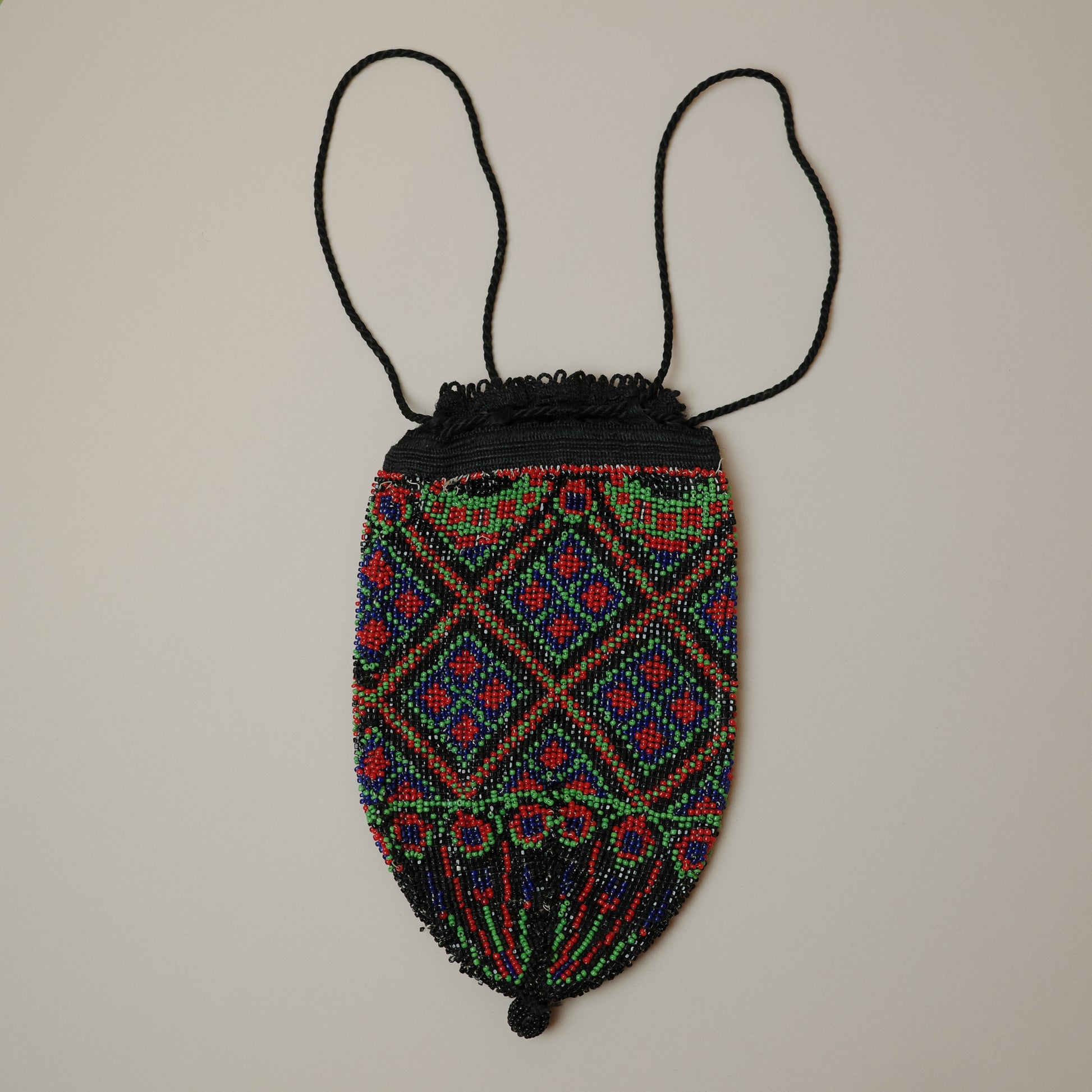 A beautifully worked Danish beaded purse, likely mid-century, with that striking geometric pattern Scandinavia loved in its folk-inspired pieces. Deep reds, greens, blues and black glass beads form a tight tapestry, ending in a soft, rounded drop and a braided drawstring top.