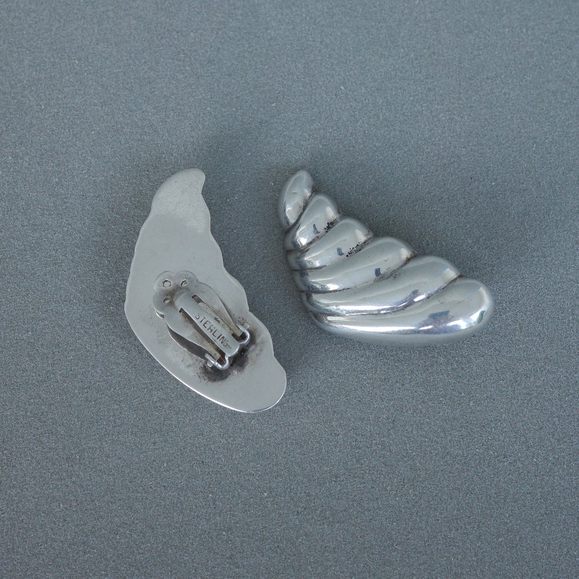 These sculptural silver earrings feature a ribbed, wing-like form with a bold, mirrored silhouette. Made in Mexico, their shape fans out gracefully from the ear, creating a striking, lifted effect.