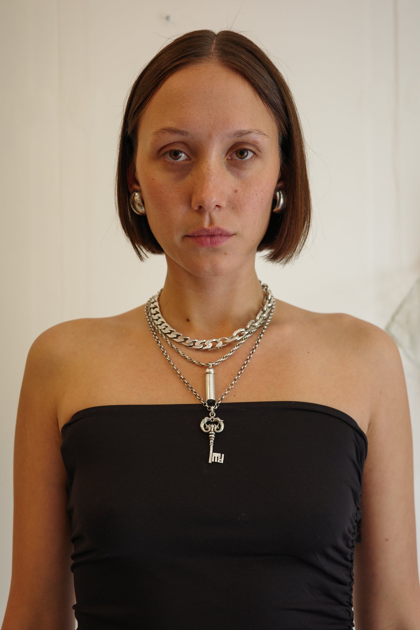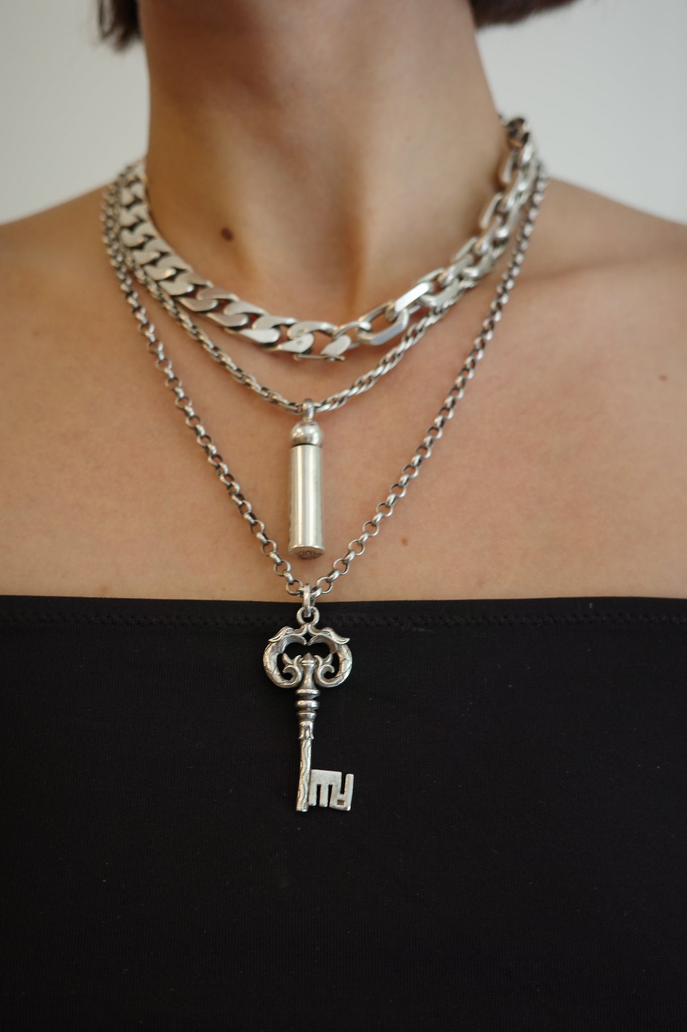 Vintage key pendant in sterling silver, paired with a sturdy vintage rolo link chain. The ornate bow and traditional barrel design suggest a mid-century origin, likely from the 1950s. Sourced in the Netherlands, this piece carries the charm of a bygone era, reminiscent of heirloom keys and hidden treasures. The pendant is solid and well-balanced, while the chain has a substantial weight and a timeless profile that complements the key perfectly.