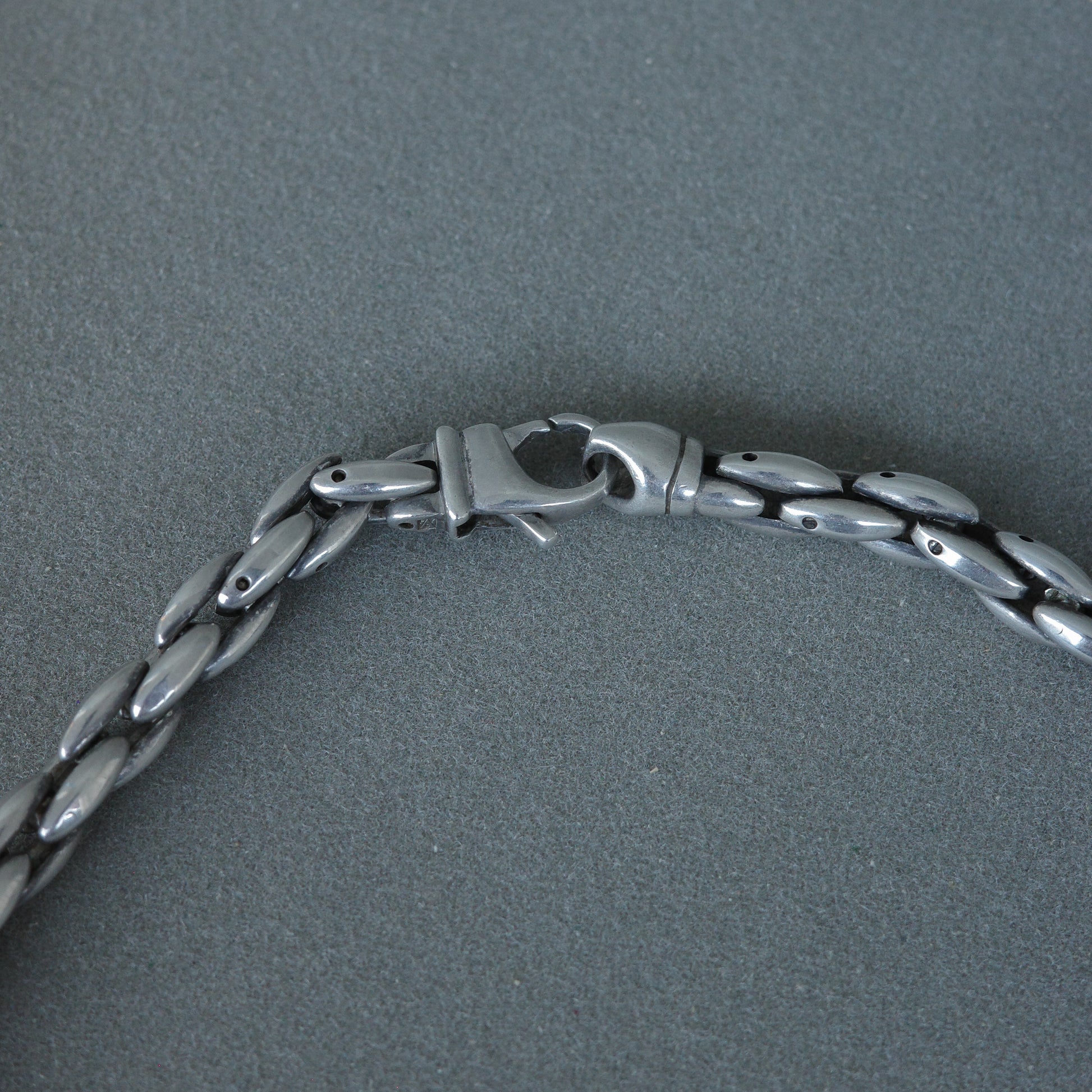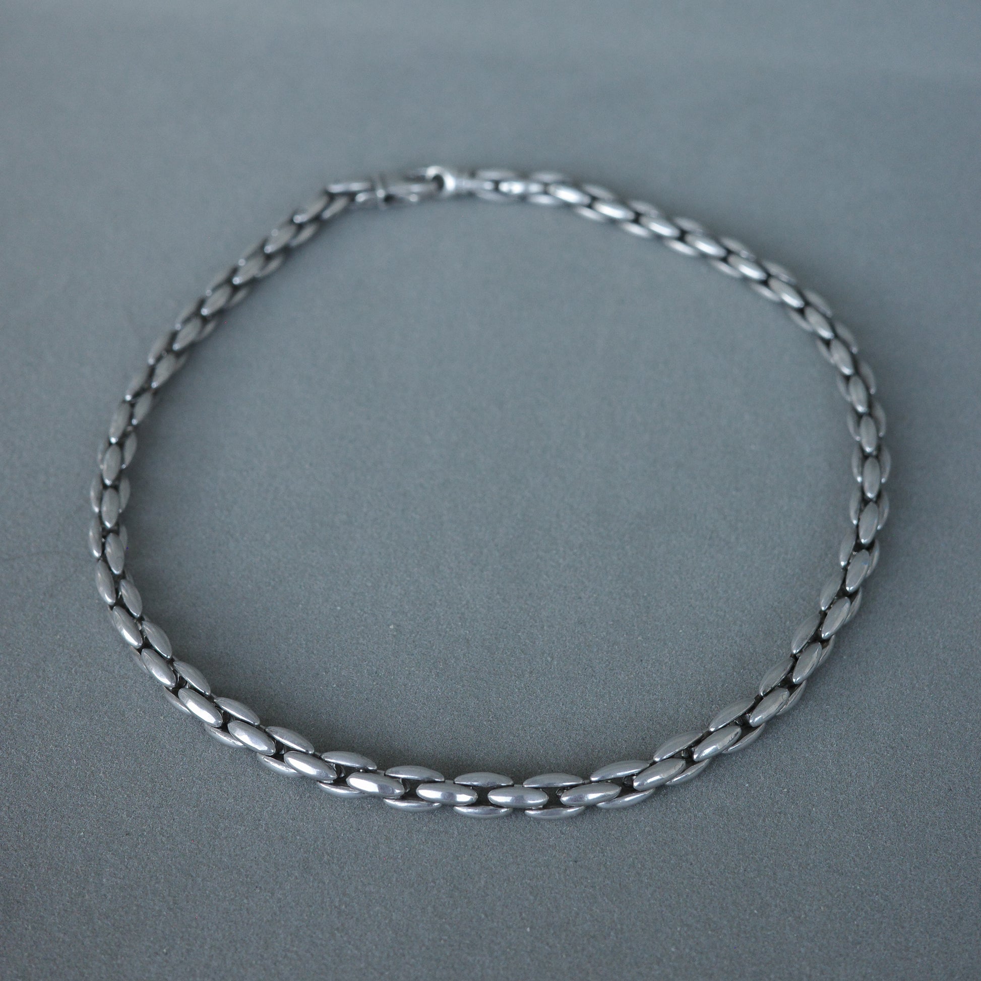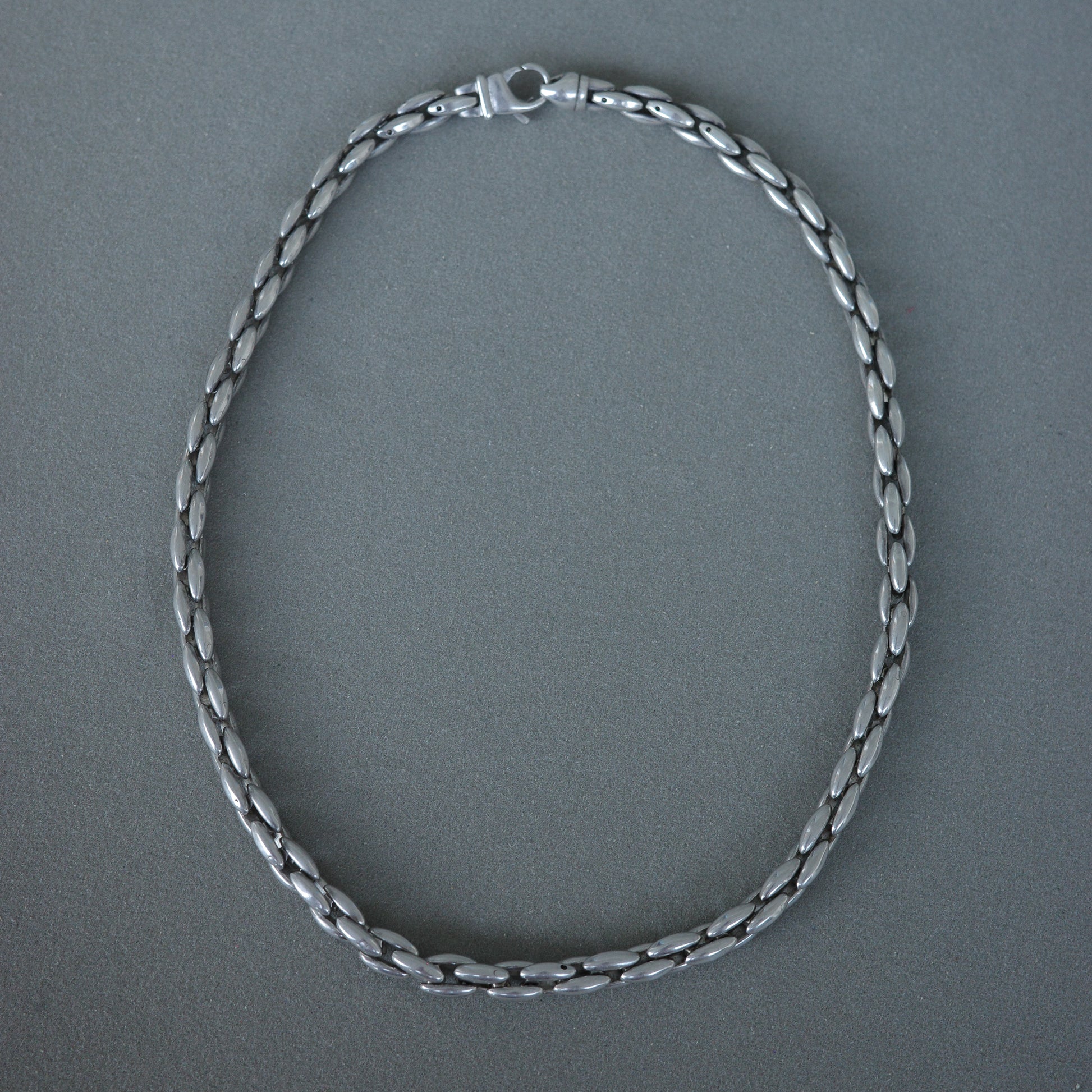A rare round rope-style link necklace sourced in Spain, with an intricate and eye-catching design. The unique link pattern gives it impressive flexibility, yet it sits firmly and securely on the collarbone with a solid, structured feel.