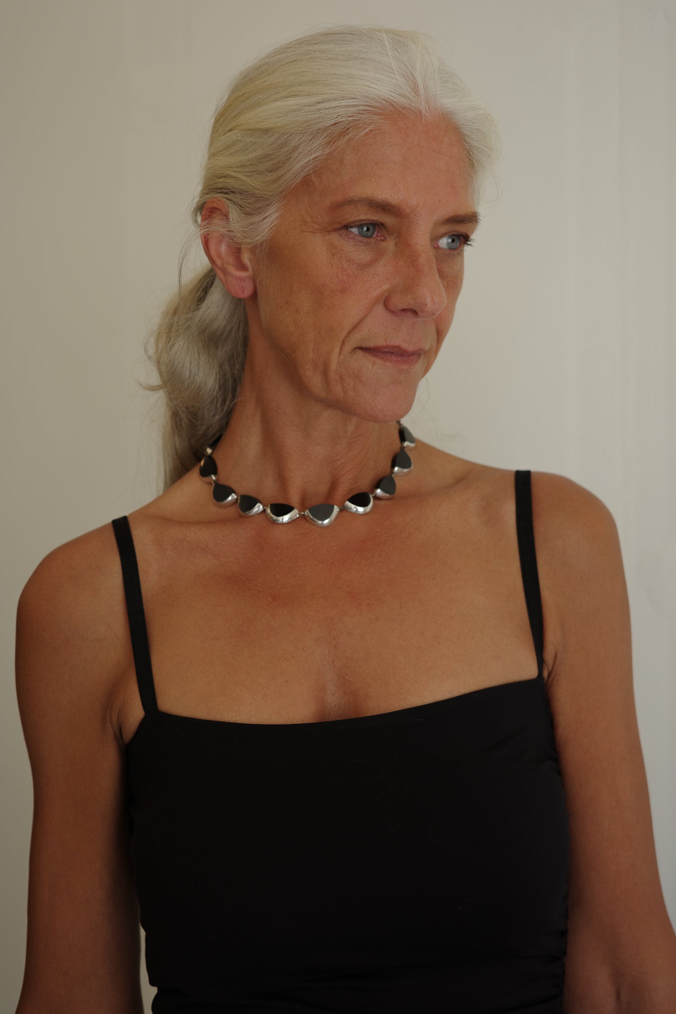 Mexican neck piece featuring 15 uniform links, each composed of black onyx set in solid sterling silver. The links are drop-shaped with clean, symmetrical lines, connected by discreet hinge joints that allow for a smooth curve around the neck. The necklace measures 41 cm in total length and weighs 42 grams, giving it a solid, substantial feel without being overly heavy. It secures with a box clasp and is marked with a Taxco hallmark.