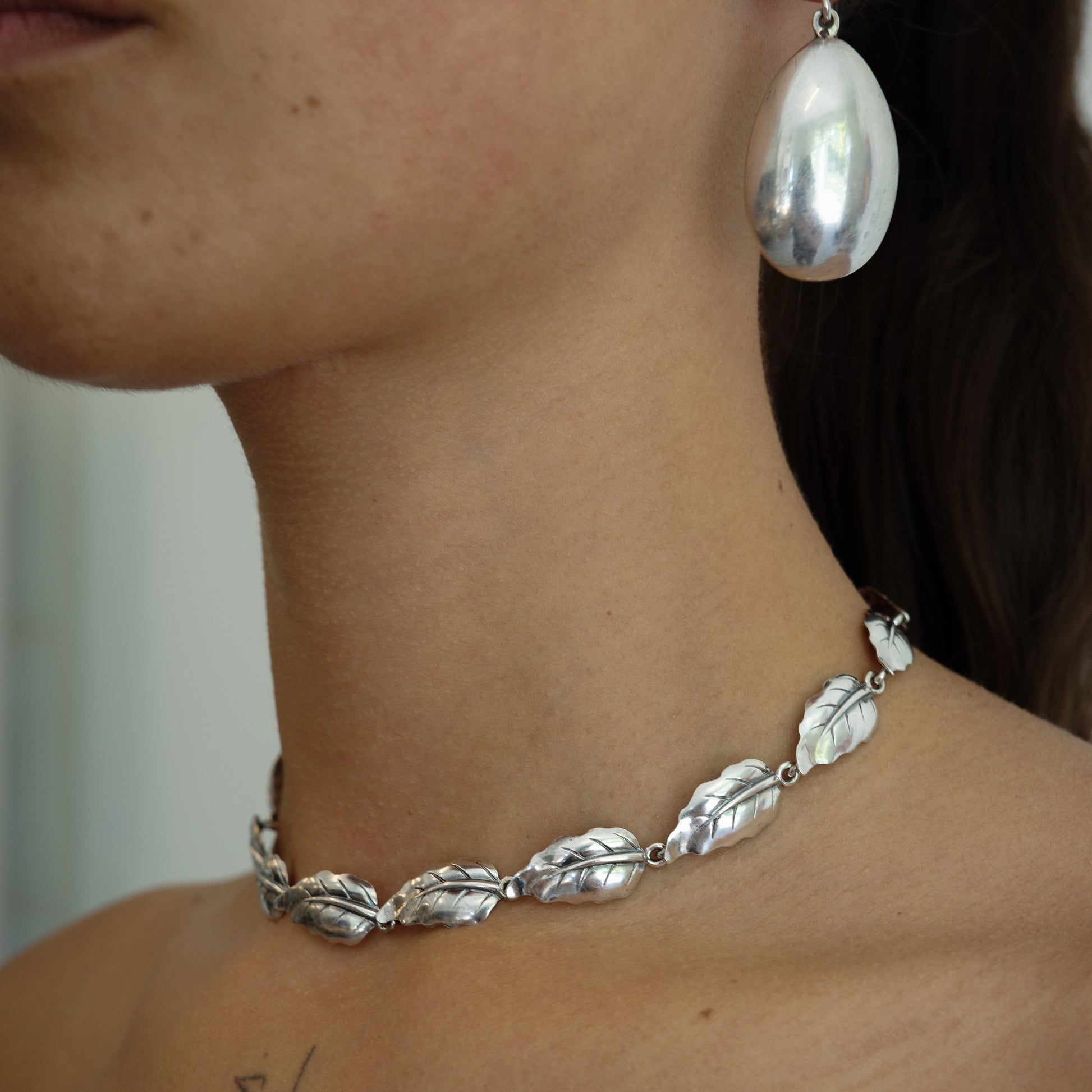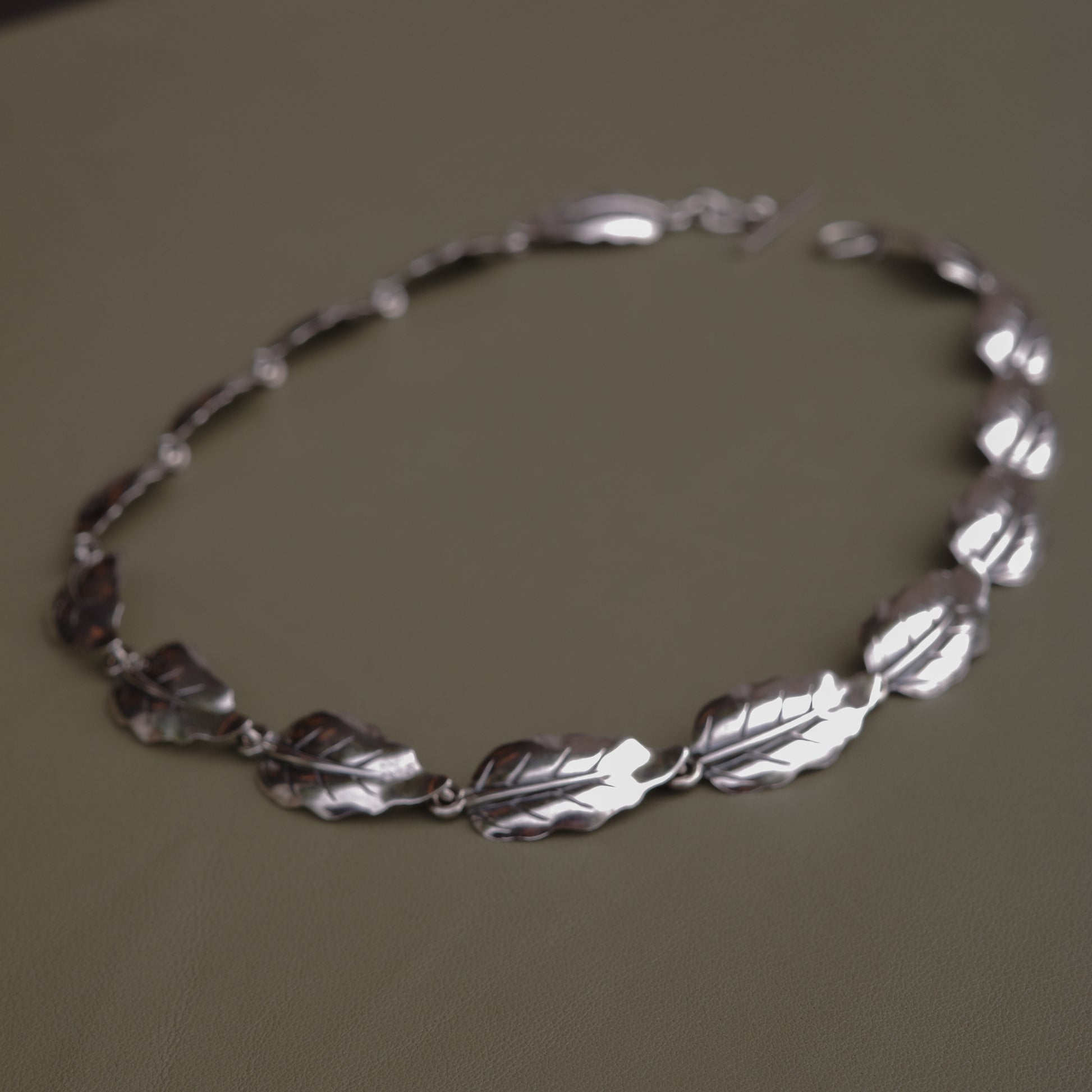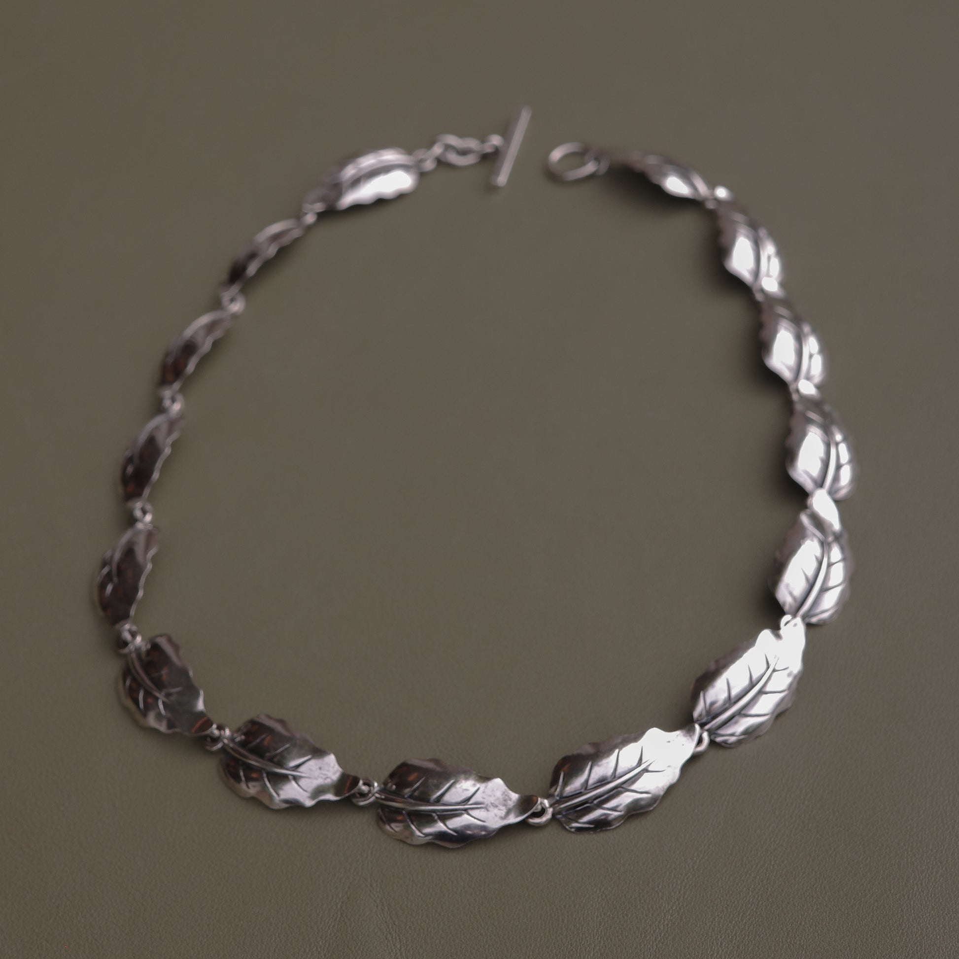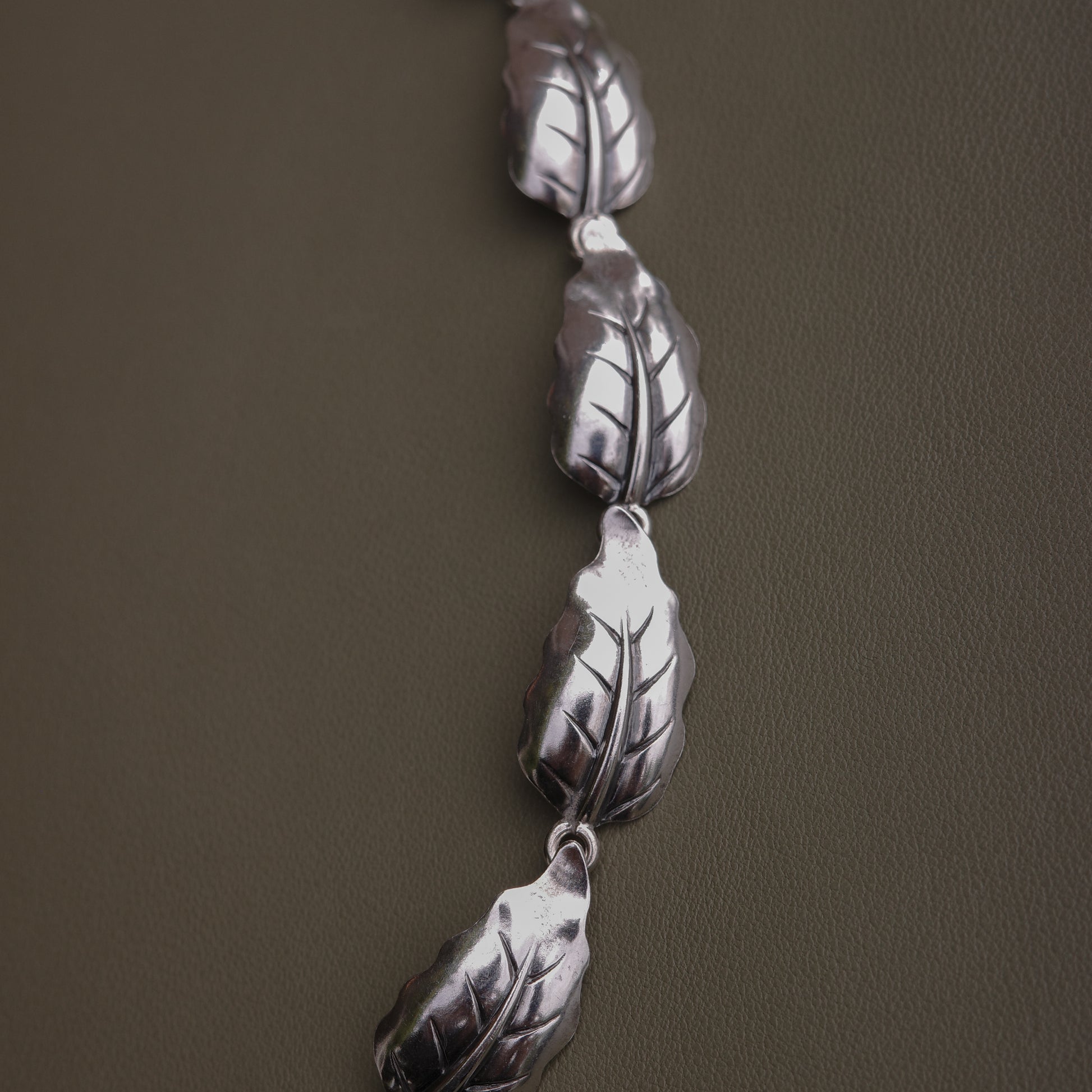 Mid-century sterling silver necklace by Niels Erik From, Denmark. Features a series of sculpted leaf links and a toggle clasp. A classic Danish modern design — can be worn as a choker or paired with its matching bracelet for a complete look.