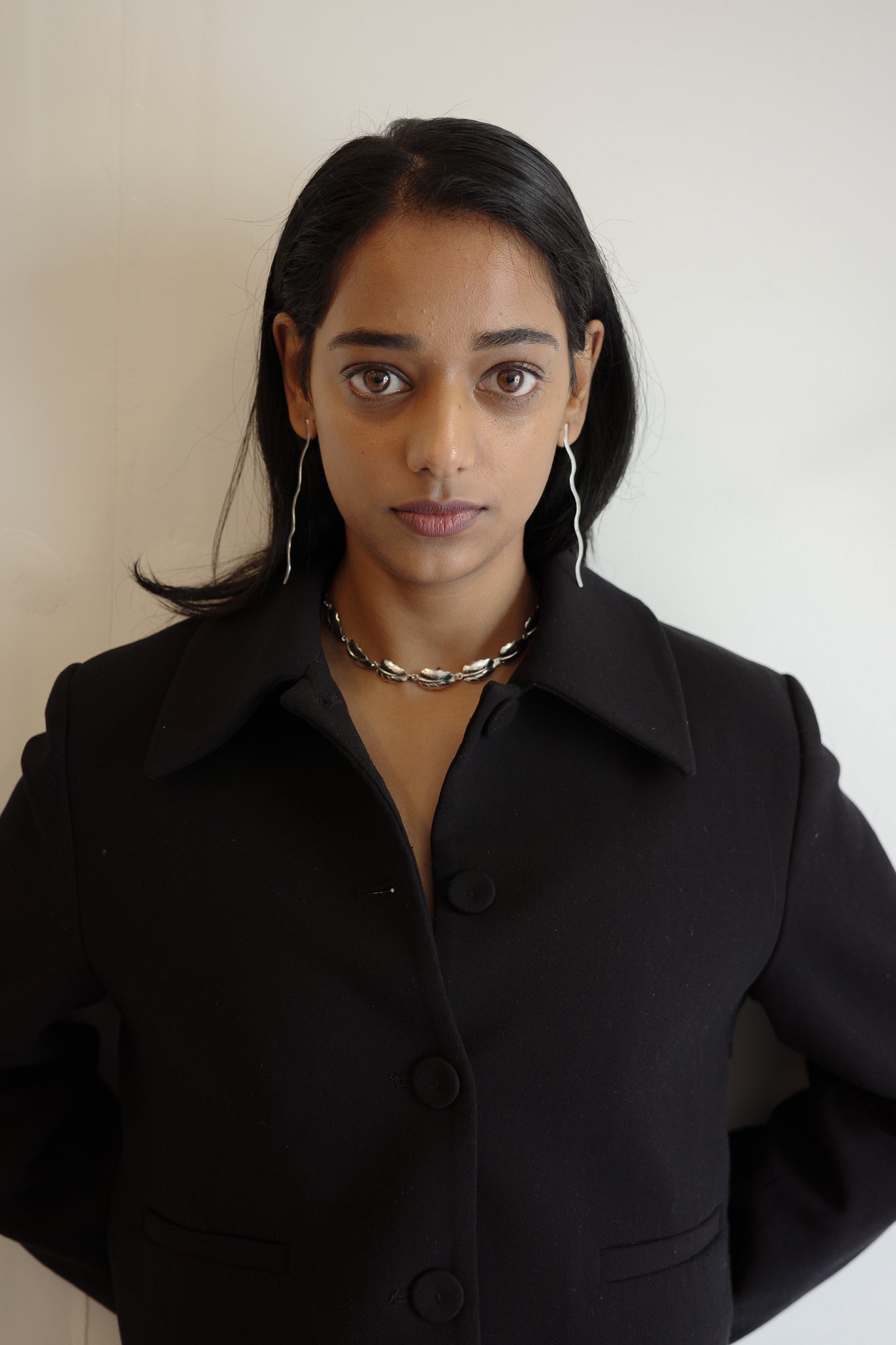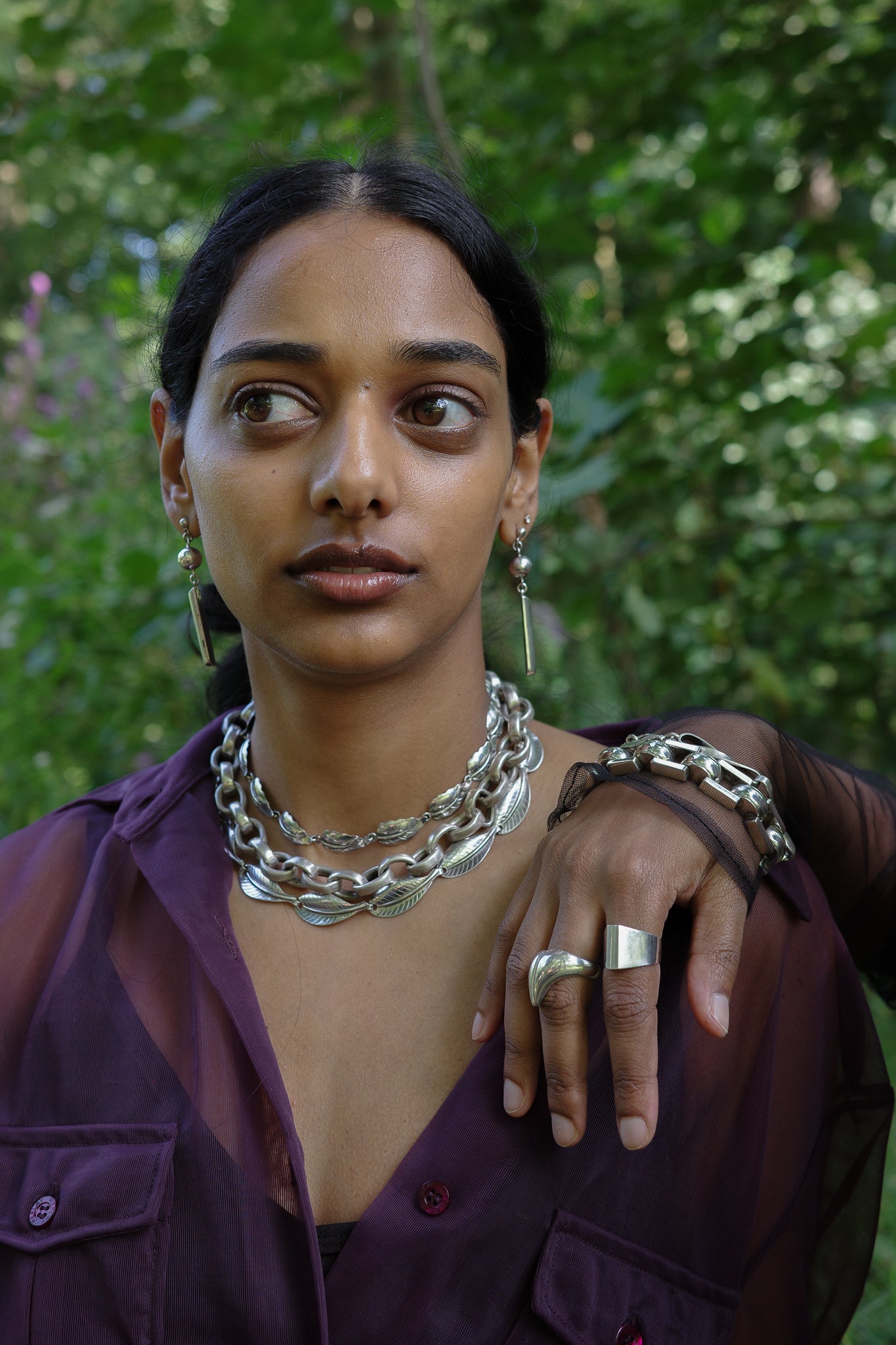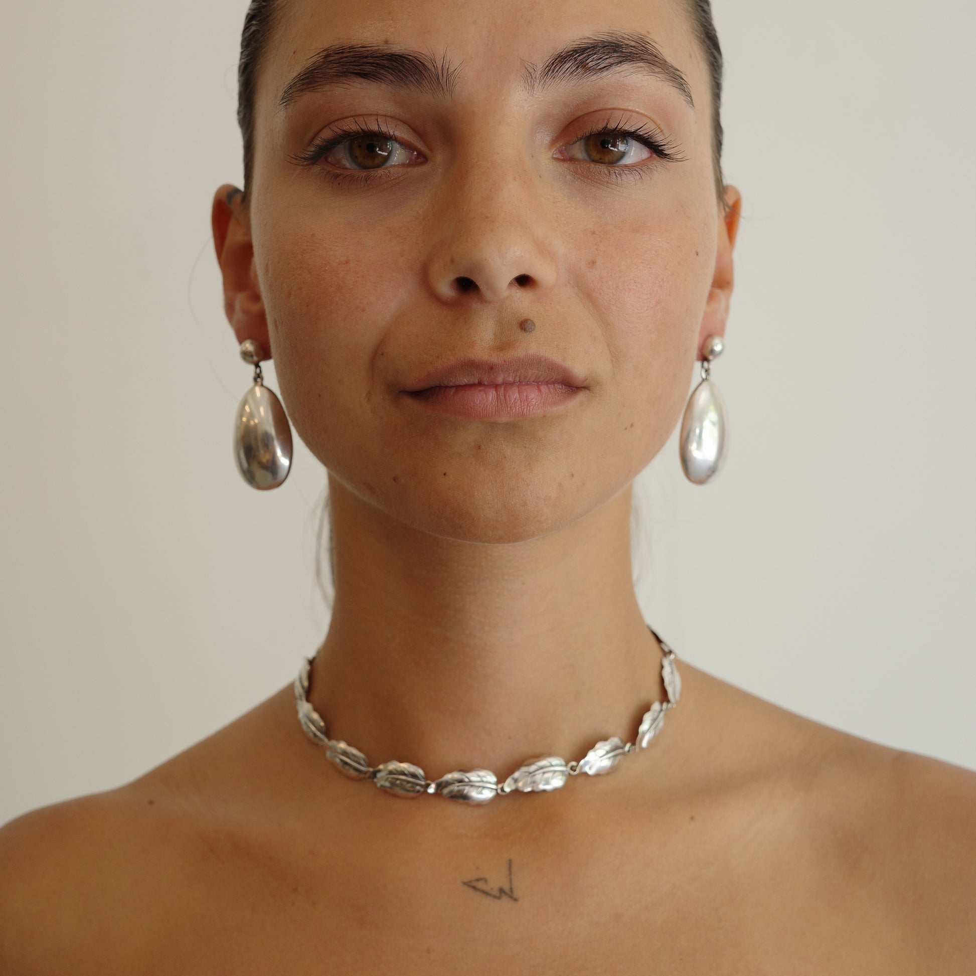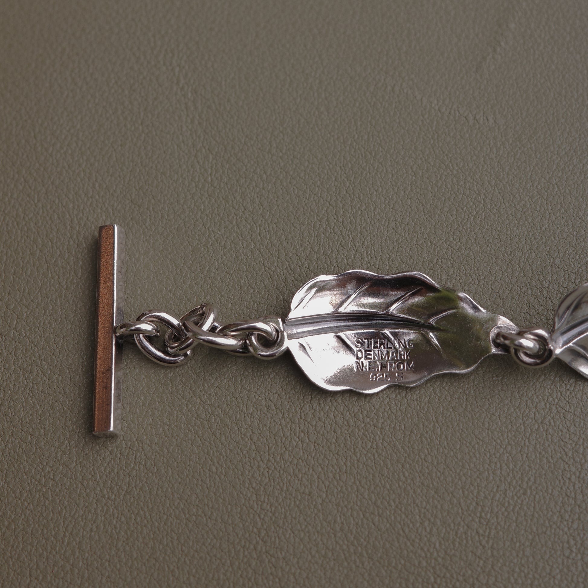 Mid-century sterling silver necklace by Niels Erik From, Denmark. Features a series of sculpted leaf links and a toggle clasp. A classic Danish modern design — can be worn as a choker or paired with its matching bracelet for a complete look.