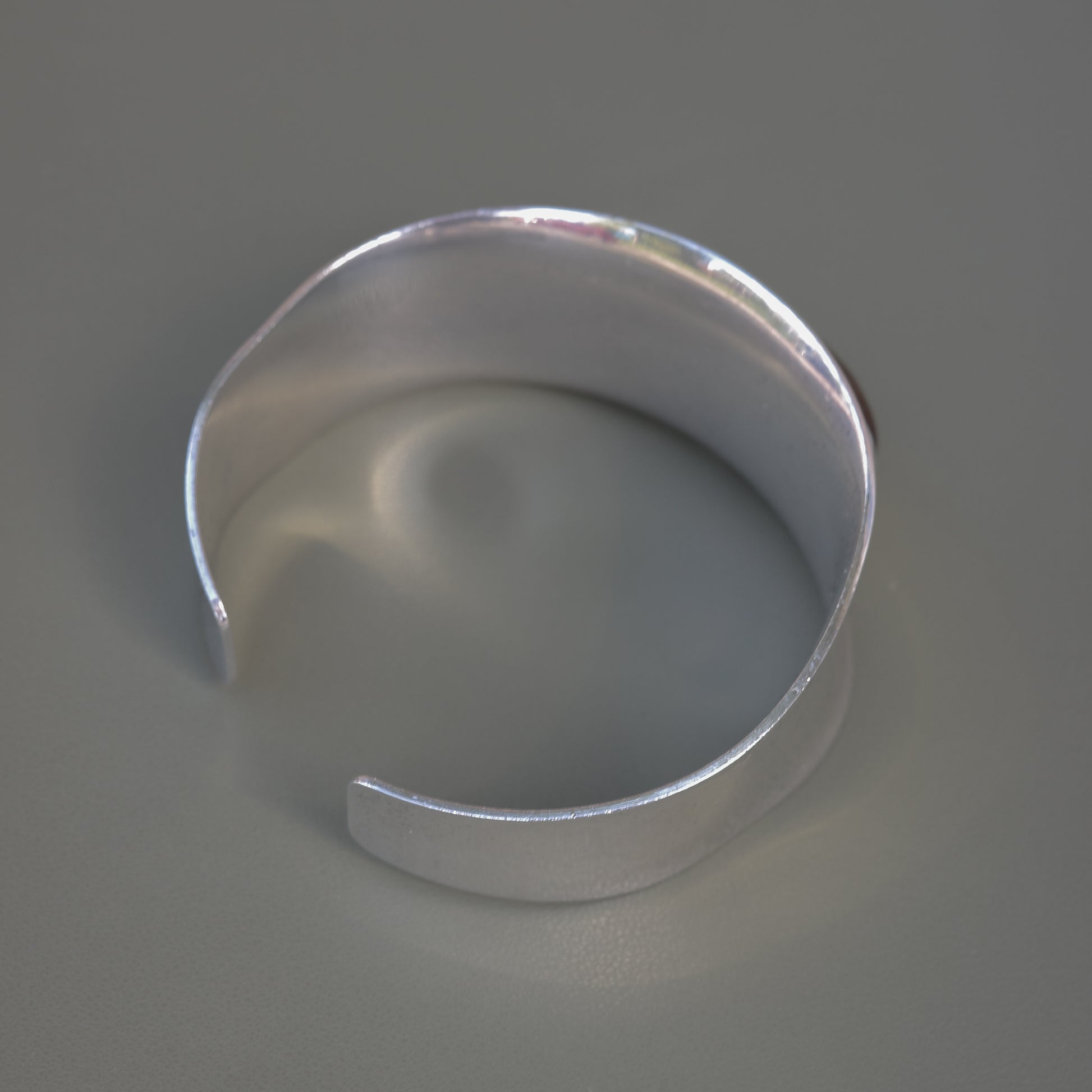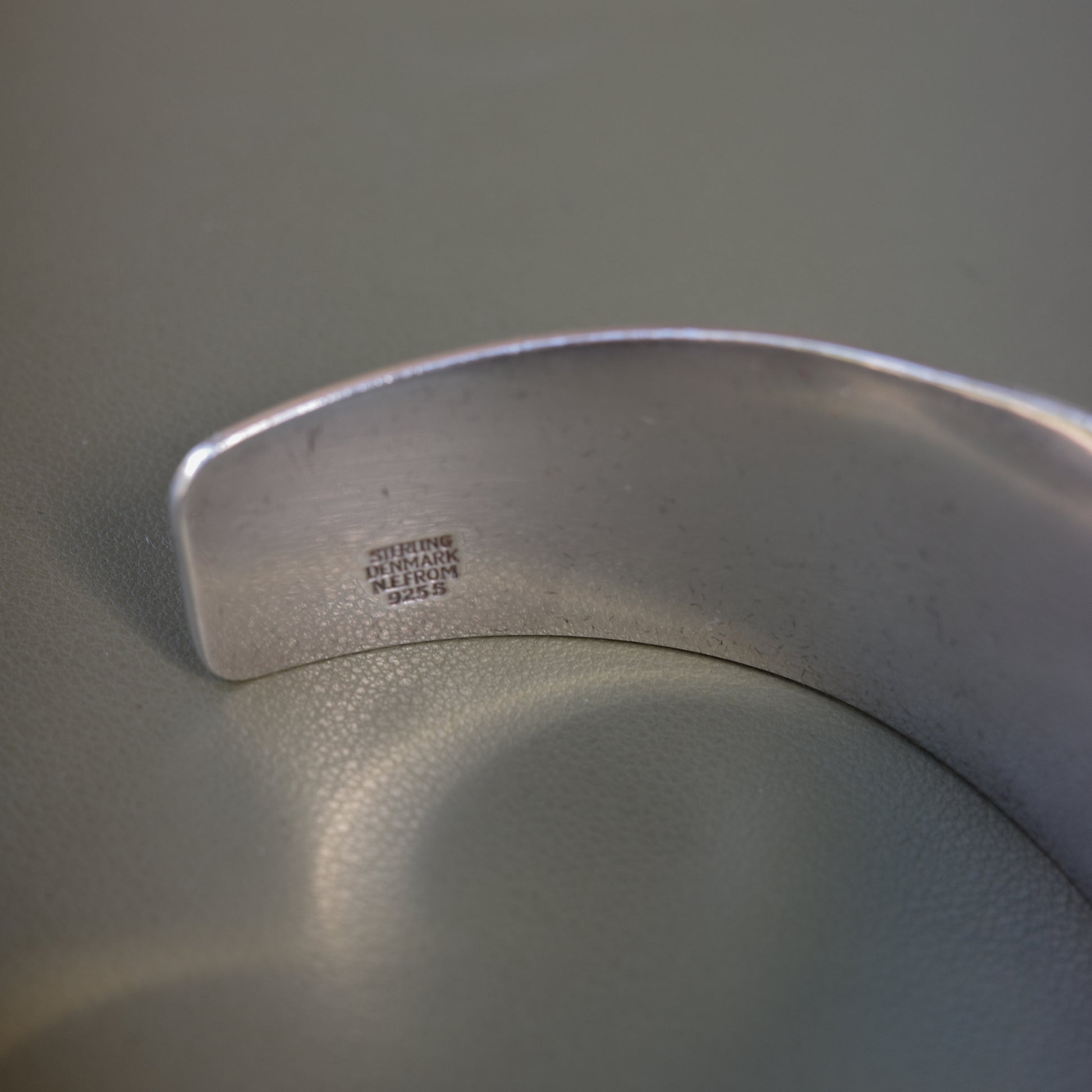 Modernist sterling silver cuff featuring a deep red Baltic amber cabochon. Designed in the style of N.E. From, this piece is both sculptural and refined — a bold yet minimal statement. The wide band has a clean, high-polish finish that complements the organic glow of the amber. Sourced in Denmark.