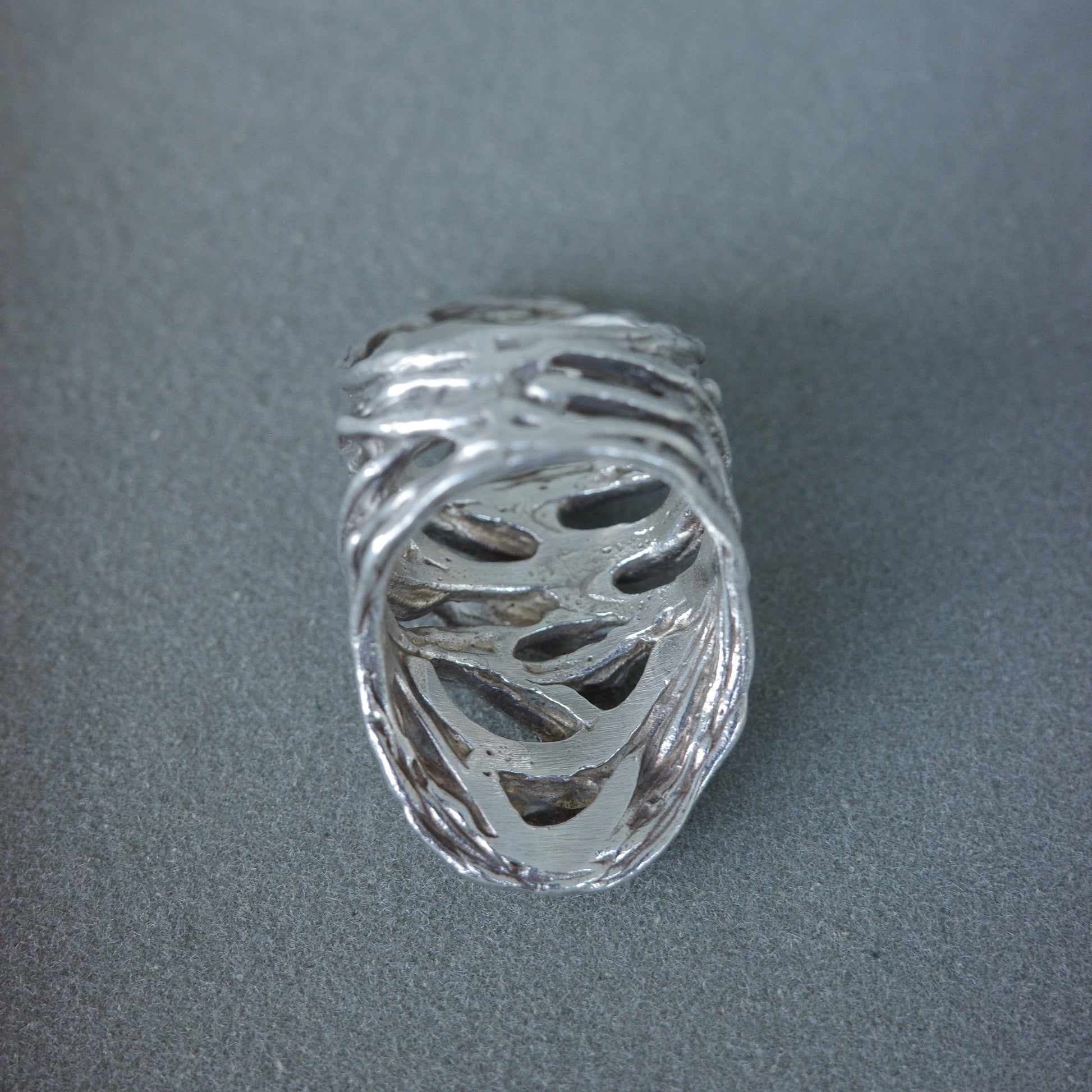 This incredibly long, sculptural ring features a tangle of textured silver strands, handcrafted into a bold, nest-like structure. Raw, abstract, and unmistakably brutalist, it wraps the finger with movement and depth.