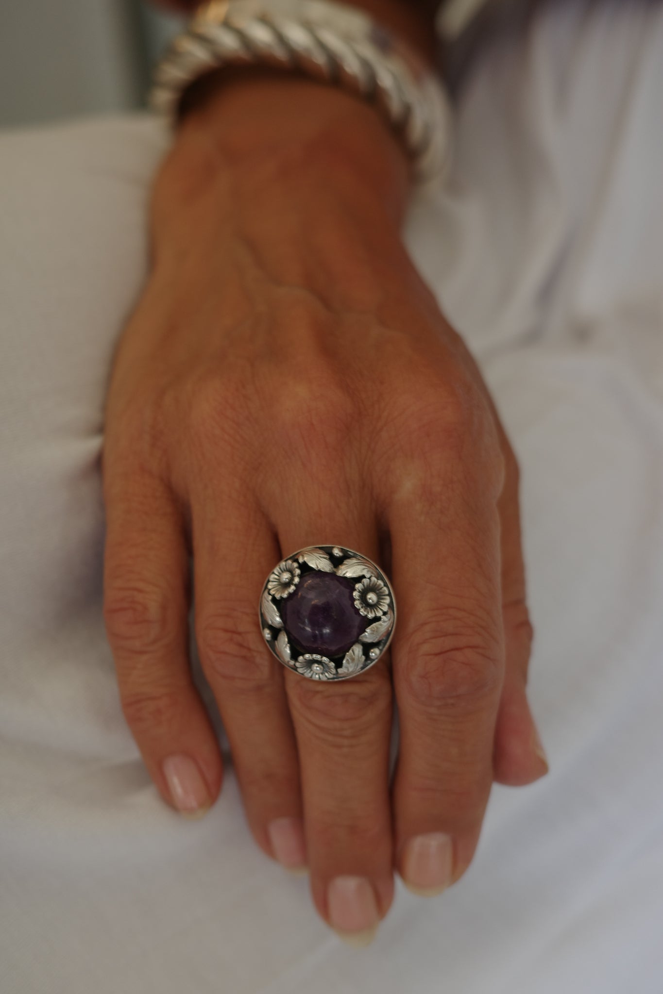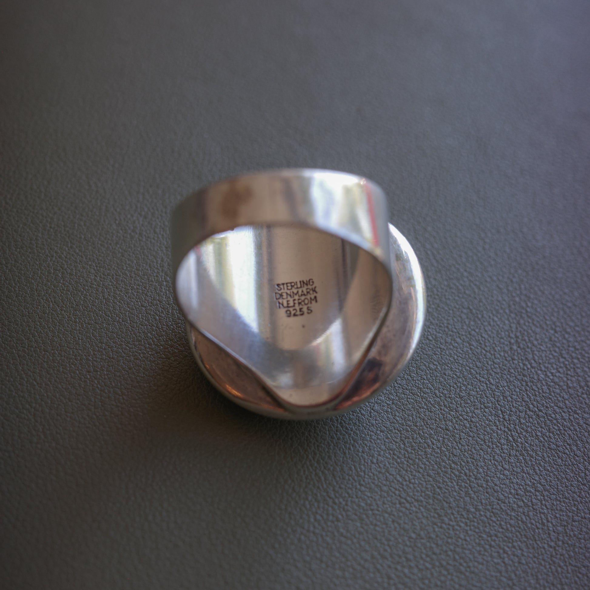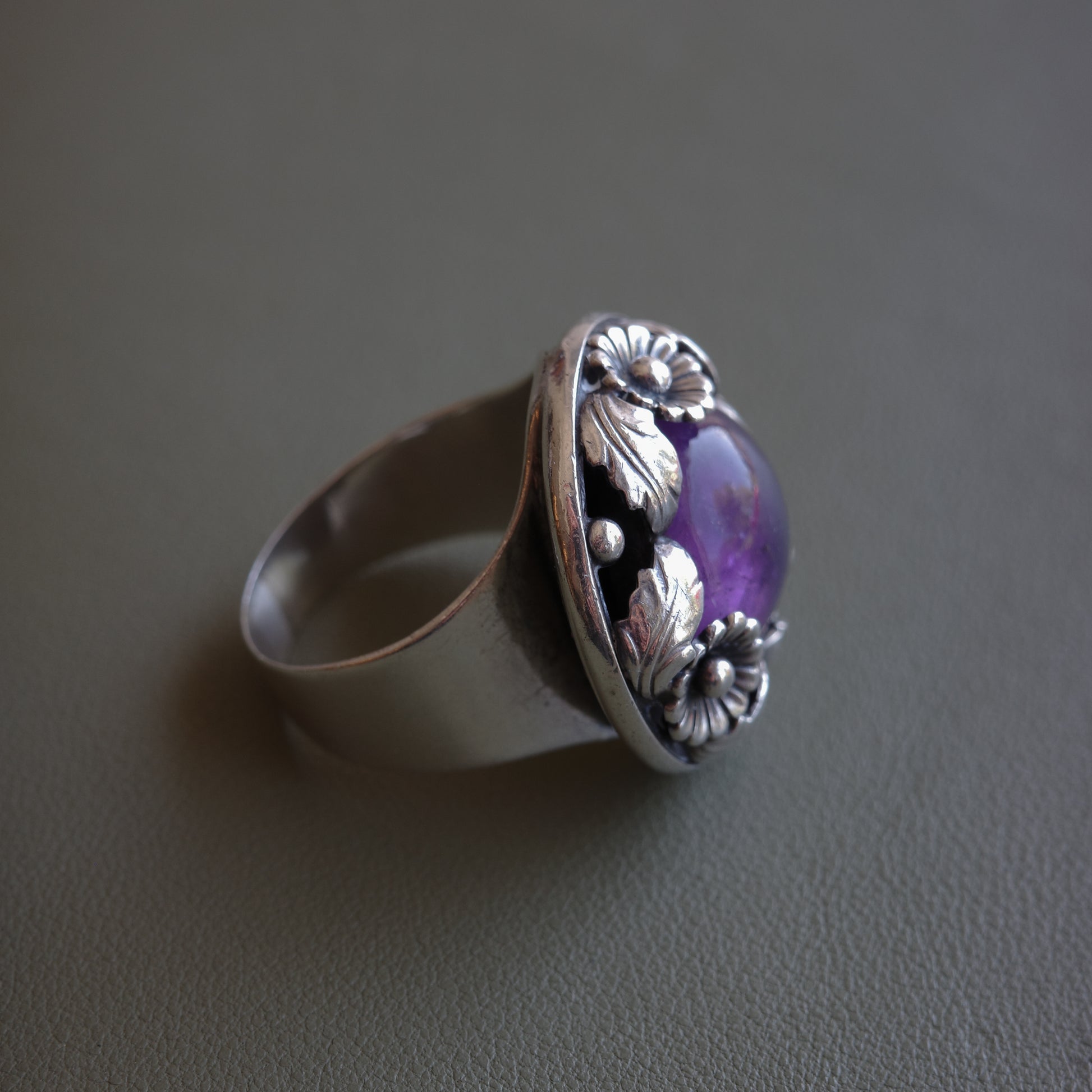 Sterling silver ring by Danish designer Niels Erik From, dating to circa 1970. The ring features a centrally set amethyst cabochon measuring approximately 14.5 mm in diameter, framed by a circular foliate motif of flowers and leaves in relief. The full diameter of the decorative head is about 25 mm. The ring has a wide shouldered shank and is stamped “N.E. From,” “Denmark,” “Sterling,” and “925S” on the inner band. A well-crafted piece that exemplifies the organic and floral aesthetic of Scandinavian modernist jewelry design from the mid-20th century.