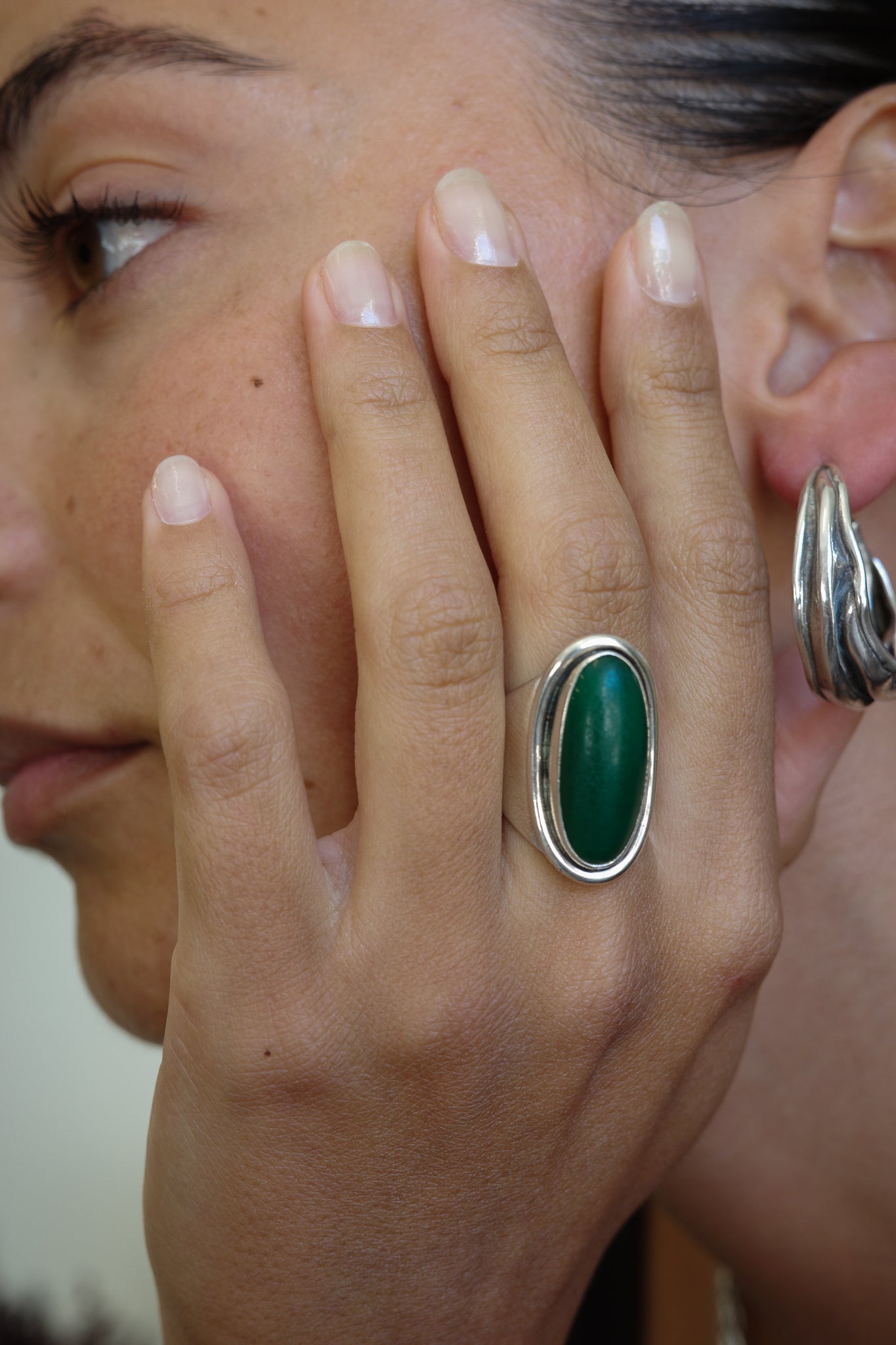 Crafted by renowned Danish silversmith Carl Ove Frydensberg, this solid 925 silver ring is a striking modernist piece from the mid-20th century. It features a large, deep green jade stone, elegantly set to highlight its natural beauty. The bold, sculptural design is typical of Scandinavian modernism—clean, minimal, and confident. A true statement ring, sourced in Denmark, that stands out effortlessly with its rich colour and refined craftsmanship.