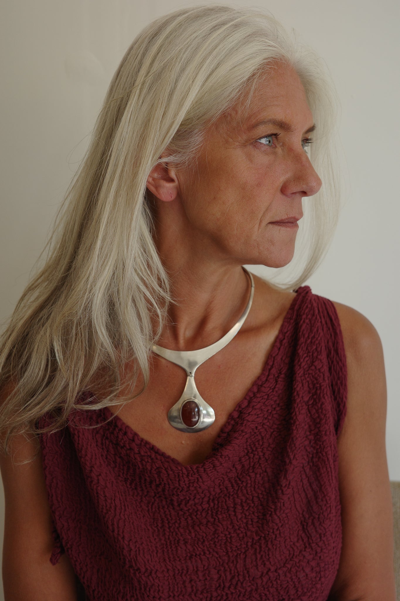 This mid-century necklace, features a sturdy, thick silver structure that comfortably hugs the neck. The focal point is a polished carnelian stone set within an organic, teardrop-shaped pendant.