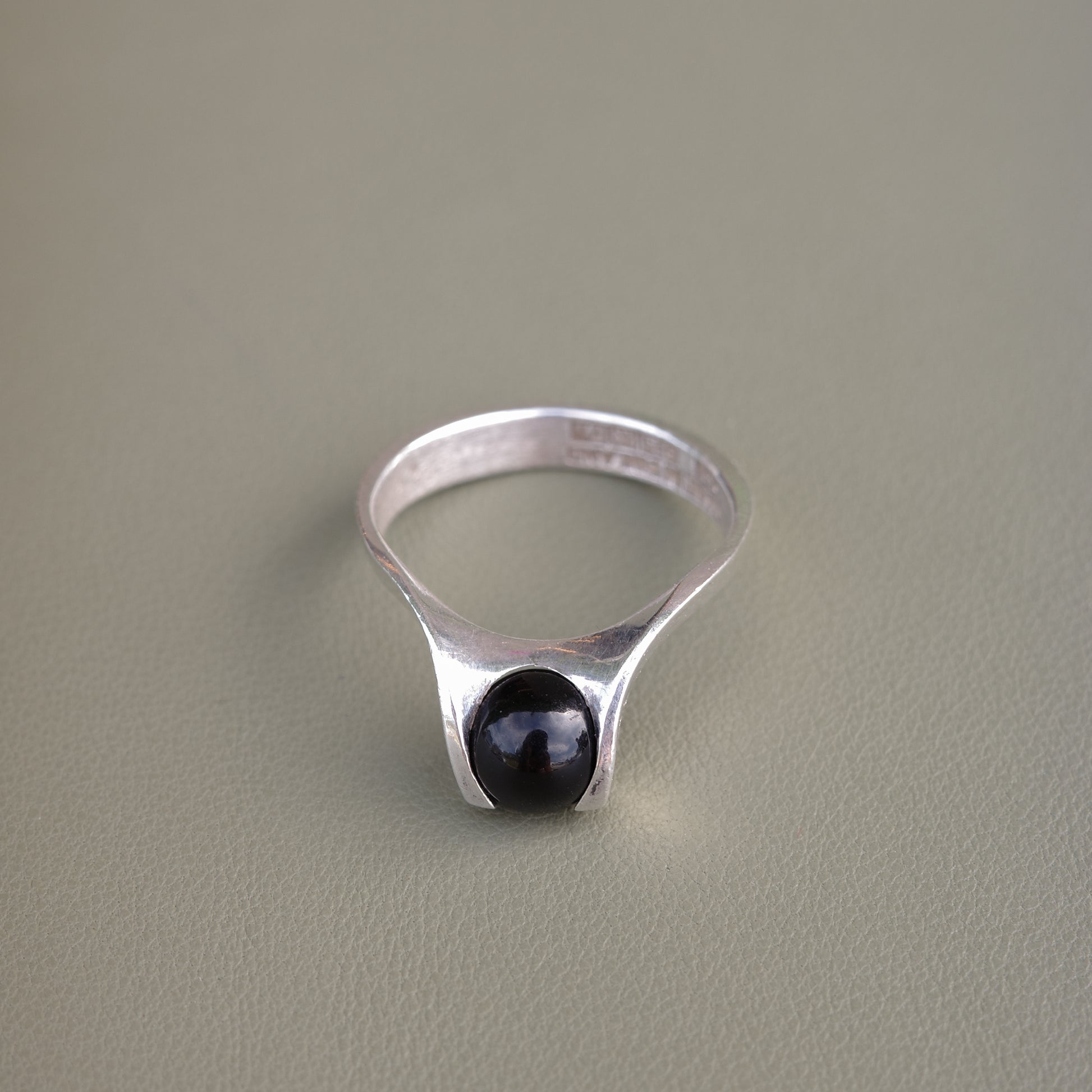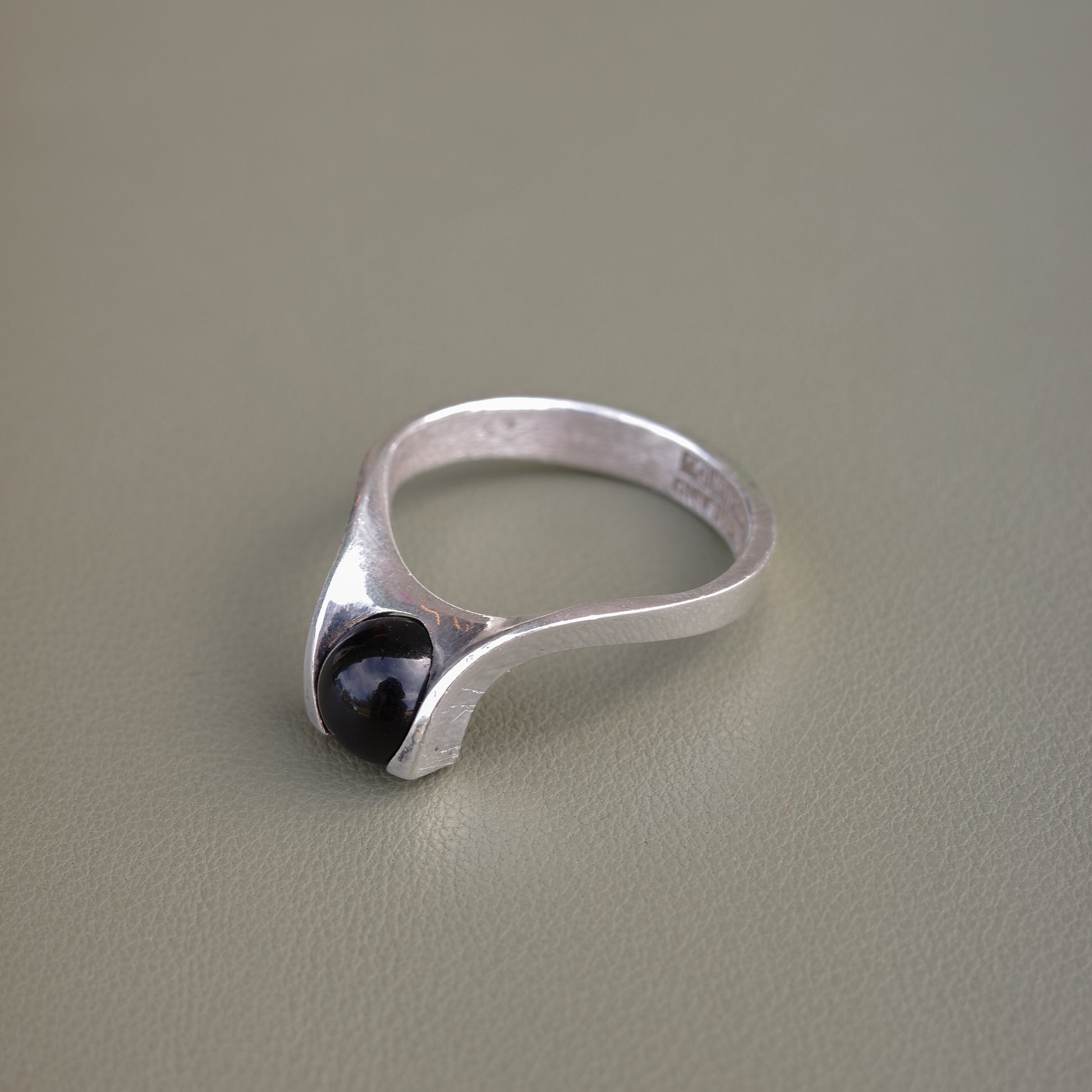Delicate Finnish silver ring featuring a smooth black onyx sphere that gently spins in its setting. Minimal yet full of character, this subtle piece adds quiet sophistication when worn alone or stacked. Its sleek silhouette and movement detail make it a refined, tactile favorite for daily wear.