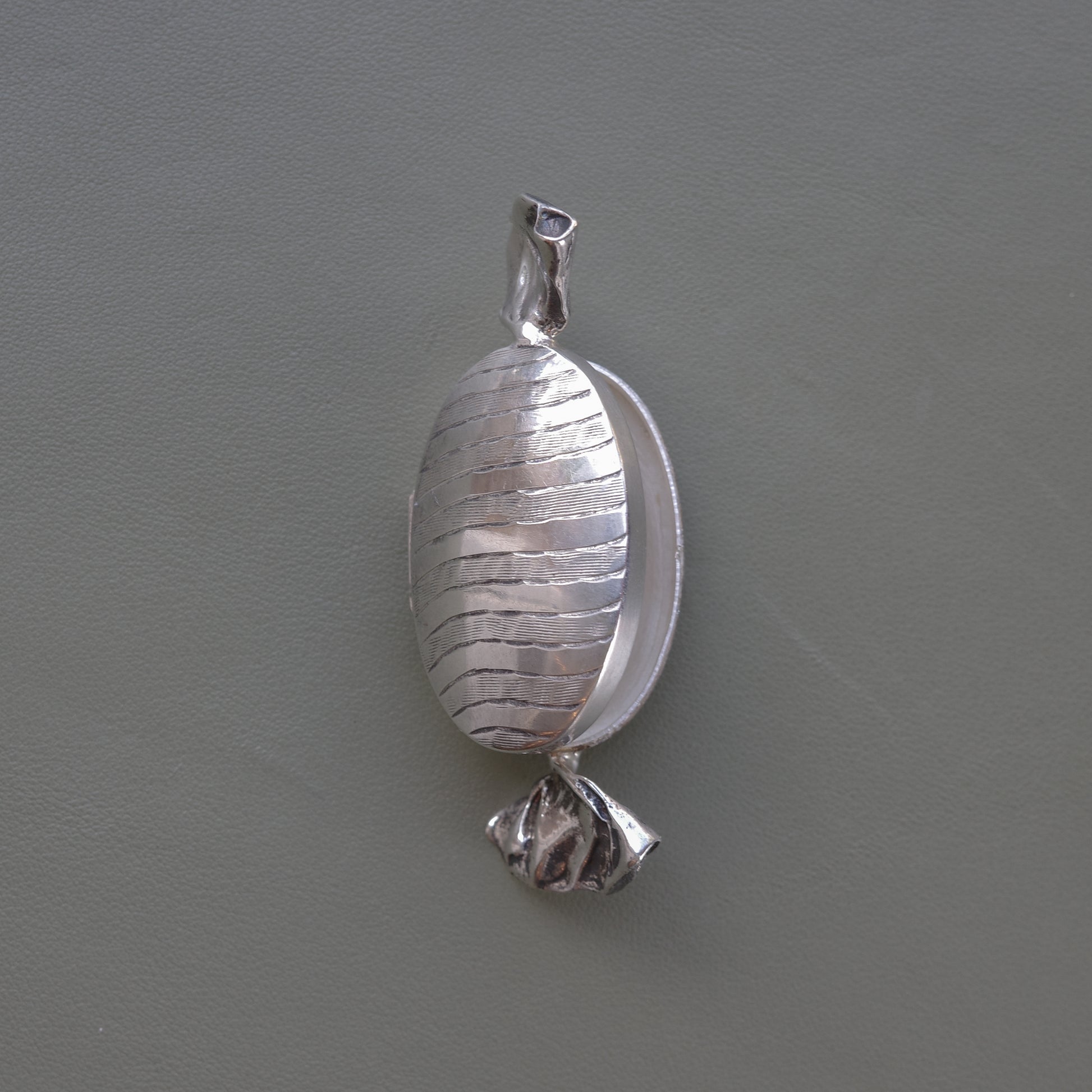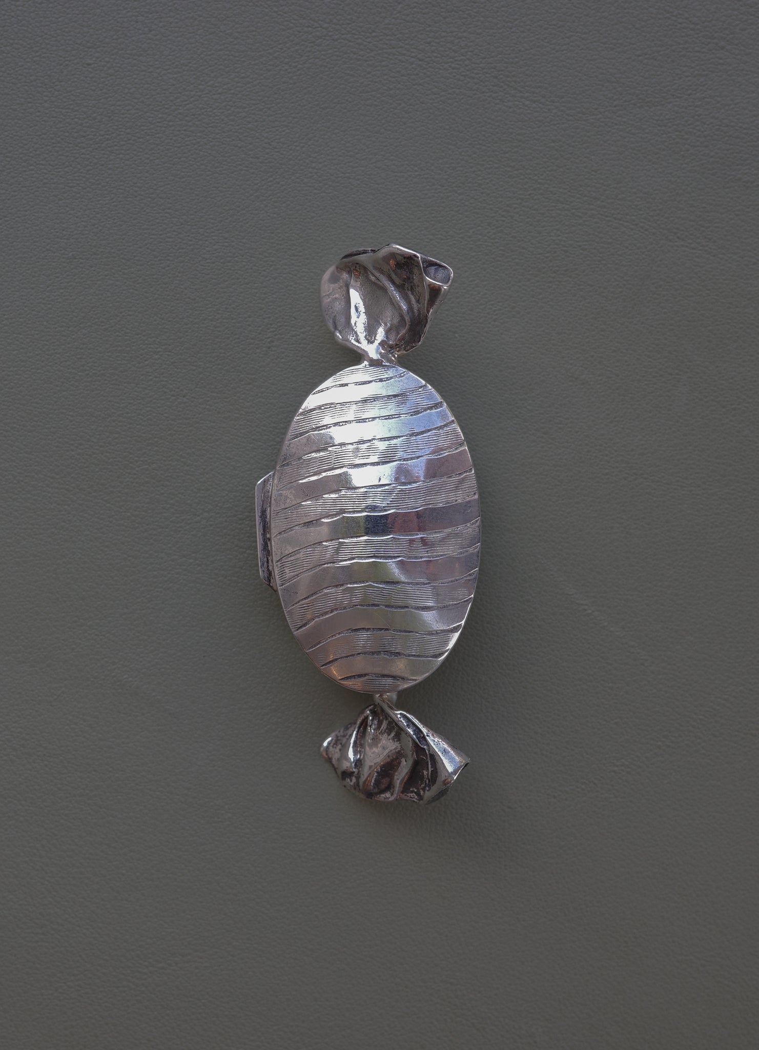This one is shaped like a wrapped candy: ribbed body, crumpled twist ends, solid sterling heft. A modernist novelty from the 1960s–80s, it flips the idea of bitter pills into something sweet, a playful reimagining of the everyday in silver.